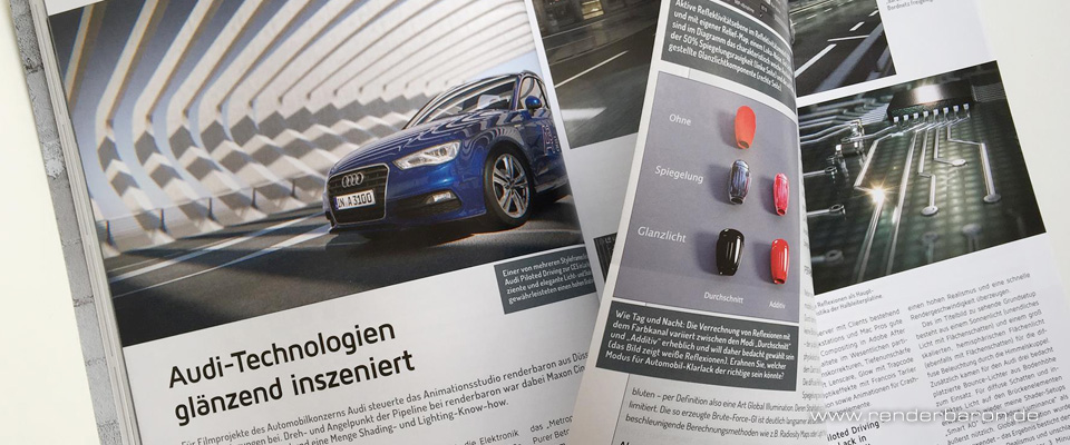 Audi Technologies staged by renderbaron Checkout a 7-pages breakdown on Visualizations for Audi in issue 06:2017 of „Digital Production" - including an indepth look at the reflectance channel in Cinema 4D.
